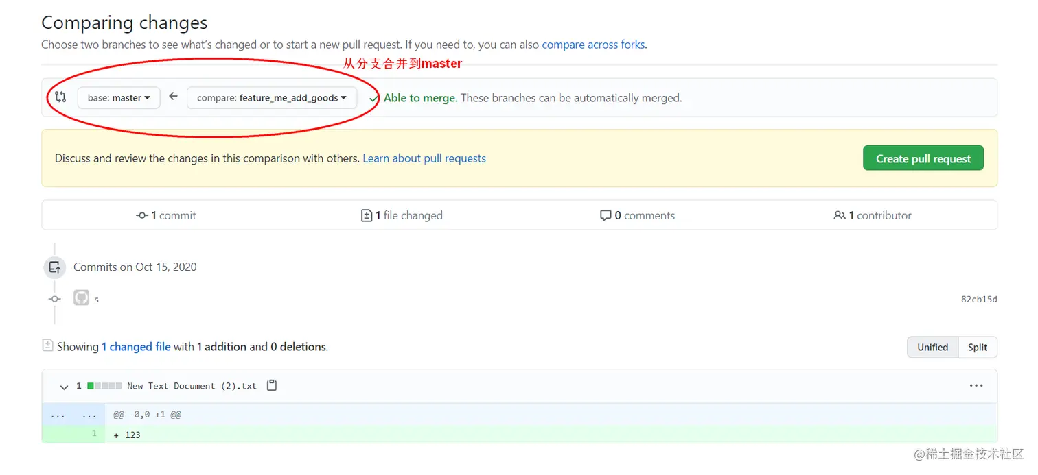 在这个界面也展示了分支和 master 的差异,不同托管平台有不同的界面,但都能找得到。