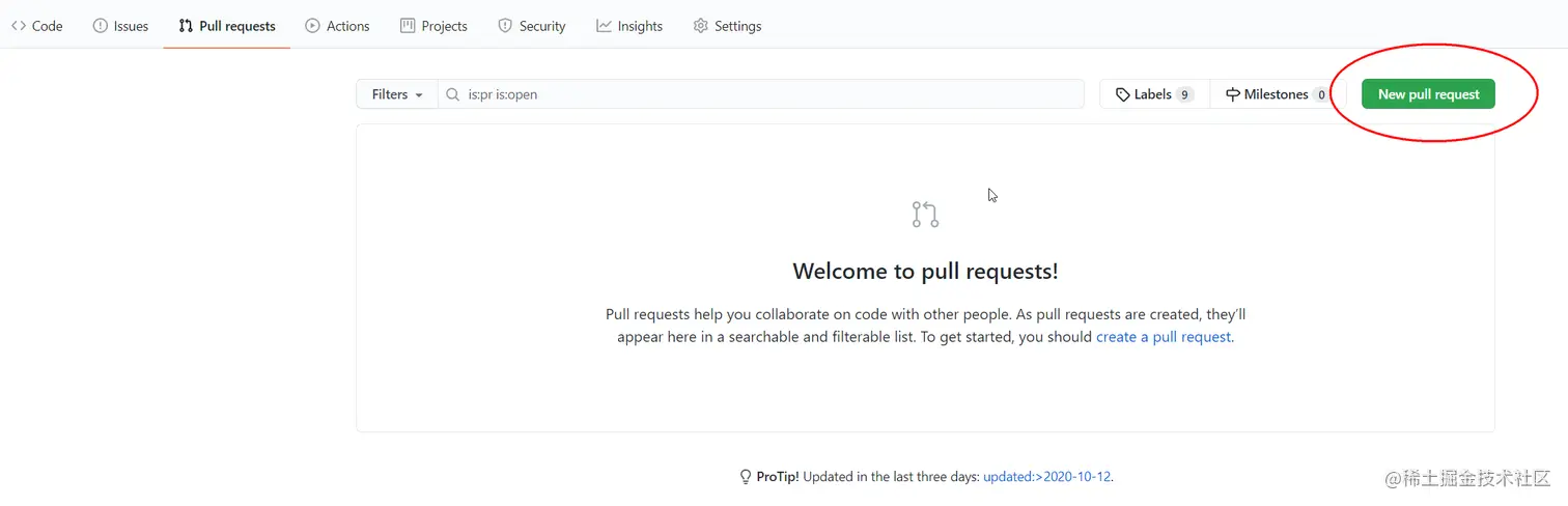 打开代码仓库后,切换到Pull requests 标签页,创建新的 pull request 请求