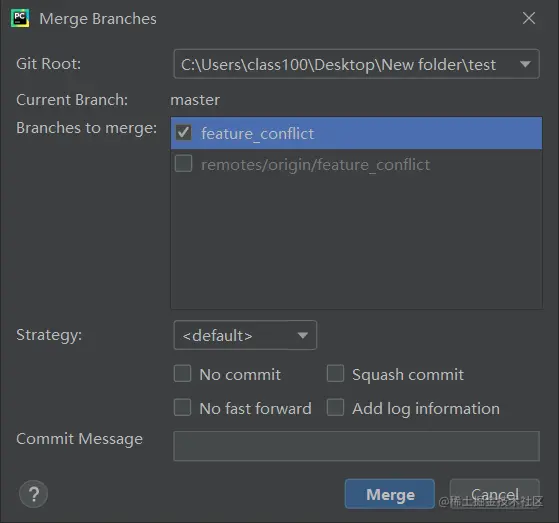 再选择分支,比如图中从 feature_conflict 合并到 master