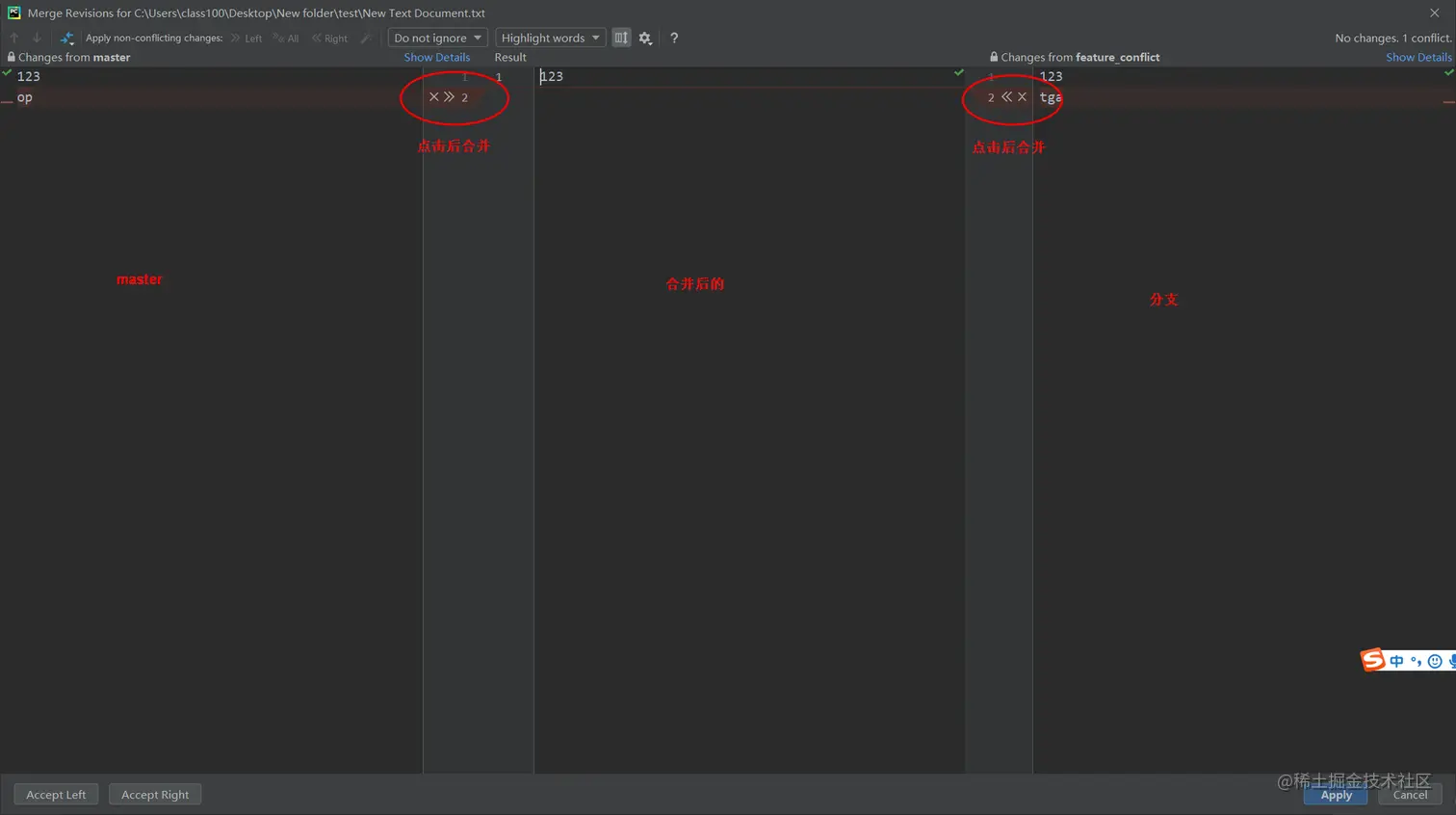 两边分别是 master 和分支的内容,中间是合并后的结果。