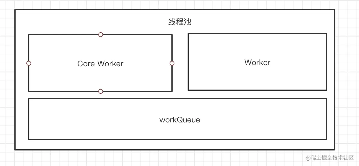 整理了一张图,把线程池分为三部分Core Worker、Worker、workQueue: