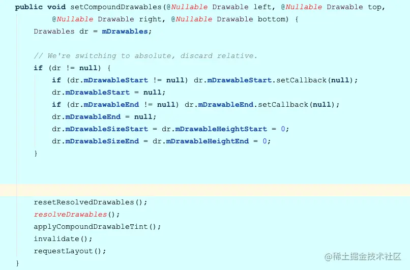 在网上看到有一个版本,在控件的onMeasure()设置Drawable.setBound(), 在onDraw()里设置: setCompoundDrawables()。看setCompoundDrawables()源码可以知道,这个方法最终会调用invalide()和requestLayout(),会导致严重的后果就是,onMeasure()和onDraw()会无限循环的互调下去,有点浪费