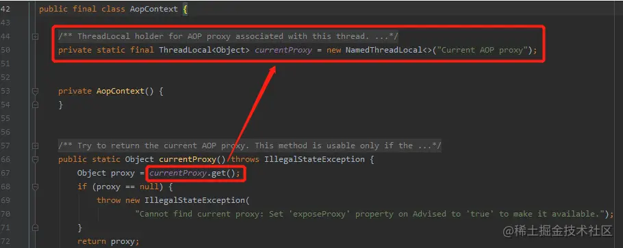 可以看到,经过一个 if 判断,如果为 true ,则调用 AopContext.setCurrentProxy 方法,把代理对象放到 AopContext 里面去。