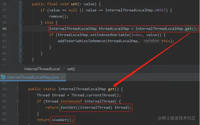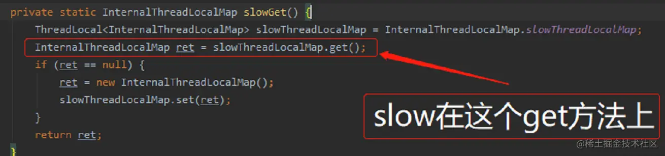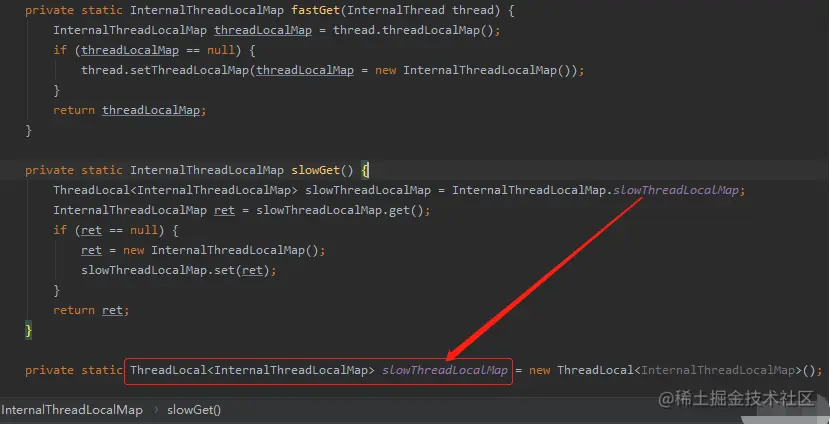 如果走到 slowGet 了,则回退到原生的 ThreadLocal ,只是在原生的里面,我还是放的 InternalThreadLocalMap: