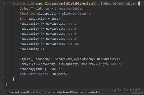 在 InternalThreadLocalMap 中扩容就是变成原来大小的 2 倍。从 32 到 64,从 64 到 128 这样。