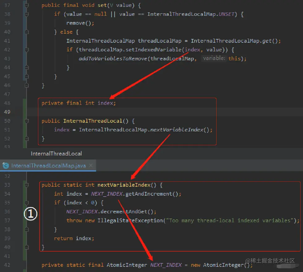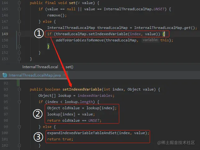 标号为 ① 的地方就是往 InternalThreadLocalMap 这个数组中存放我们传进来的 value。