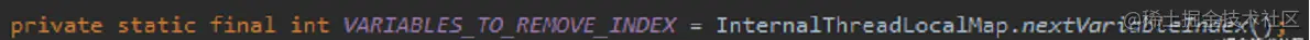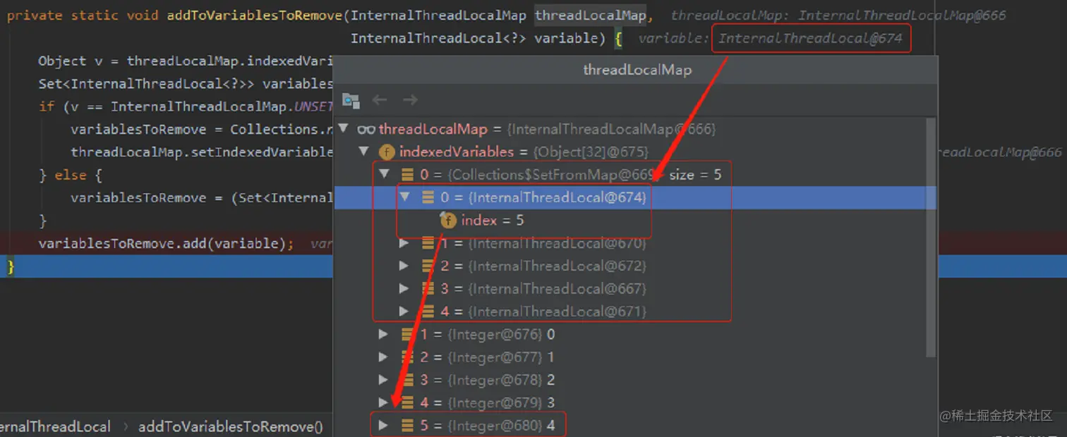 在第 21 行打上断点,然后看一下执行完 addToVariablesToRemove 方法后,InternalThreadLocalMap 数组的情况: