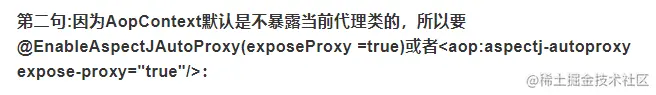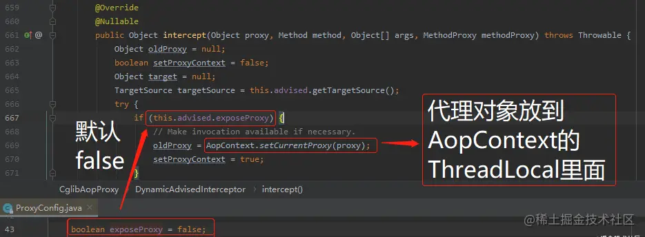 而这个 if 判断的配置默认是 false,所以需要通过刚刚说的配置修改为 true,这样 AopContext 才会生效。