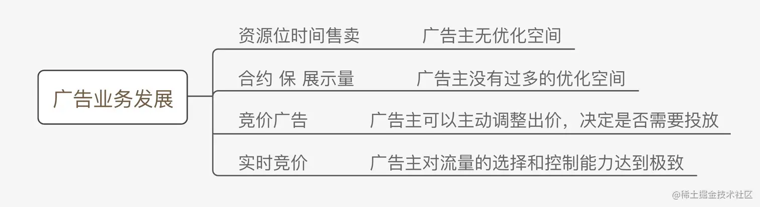 广告业务经过不断的发展:从单个资源位按时间售卖,到后来的以合约的形式保展示量,再到后来以竞价的方式销售资源位,以及现在的实时竞价,这个发展可以看出在数据的驱动下变得越来越精细化。