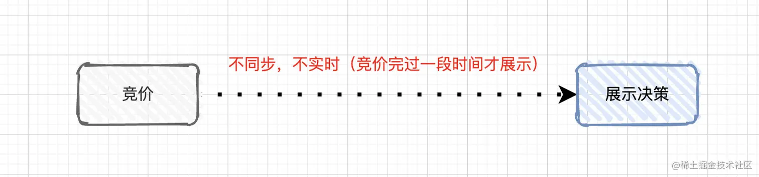但这种的竞价并不是实时的,它是先通过关键字/人群的方式把广告位放出去,然后让广告主进行竞价,等到竞价完了以后再决定是否要展示这个广告,这里的出价和展示决策并不是同步的。