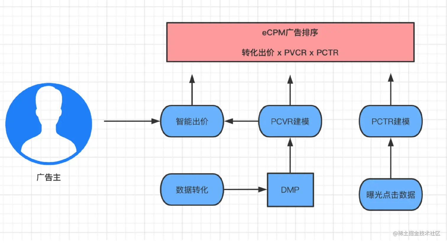 eCPM是媒体衡量广告效果的指标:如果以CPM的方式计费,那么eCPM=CPM,那如果以CPC的方式计费呢?eCPM=预估点击率*出价,如果以CPS的方式计费呢?eCPM=预估转化率*预估点击率*出价