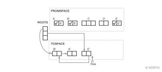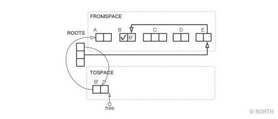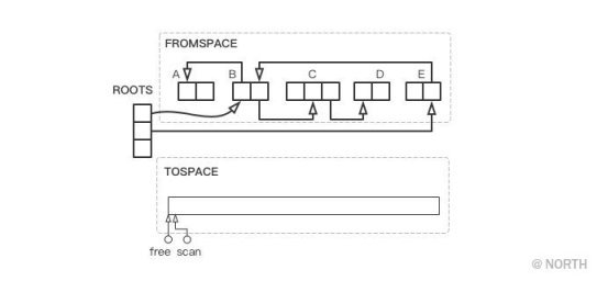 这时,与根节点直接引用的对象都已经复制完毕,scan 仍然指向TOSPACE的起点,free 从起点向前移动了B和E个长度。