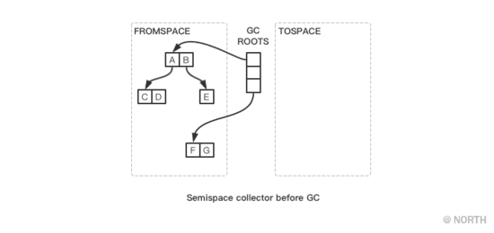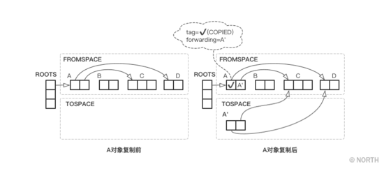 对象B复制完成后,它引用的对象A还在FROMSPACE里,接下来就会把对象A复制到TOSPACE中。