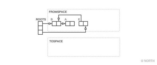 还是以一个简单的例子来看看Cheney算法的执行过程,首先还是初始状态,在前面的例子上做了一点改动,同时有两个指针指向TOSPACE的起点位置。