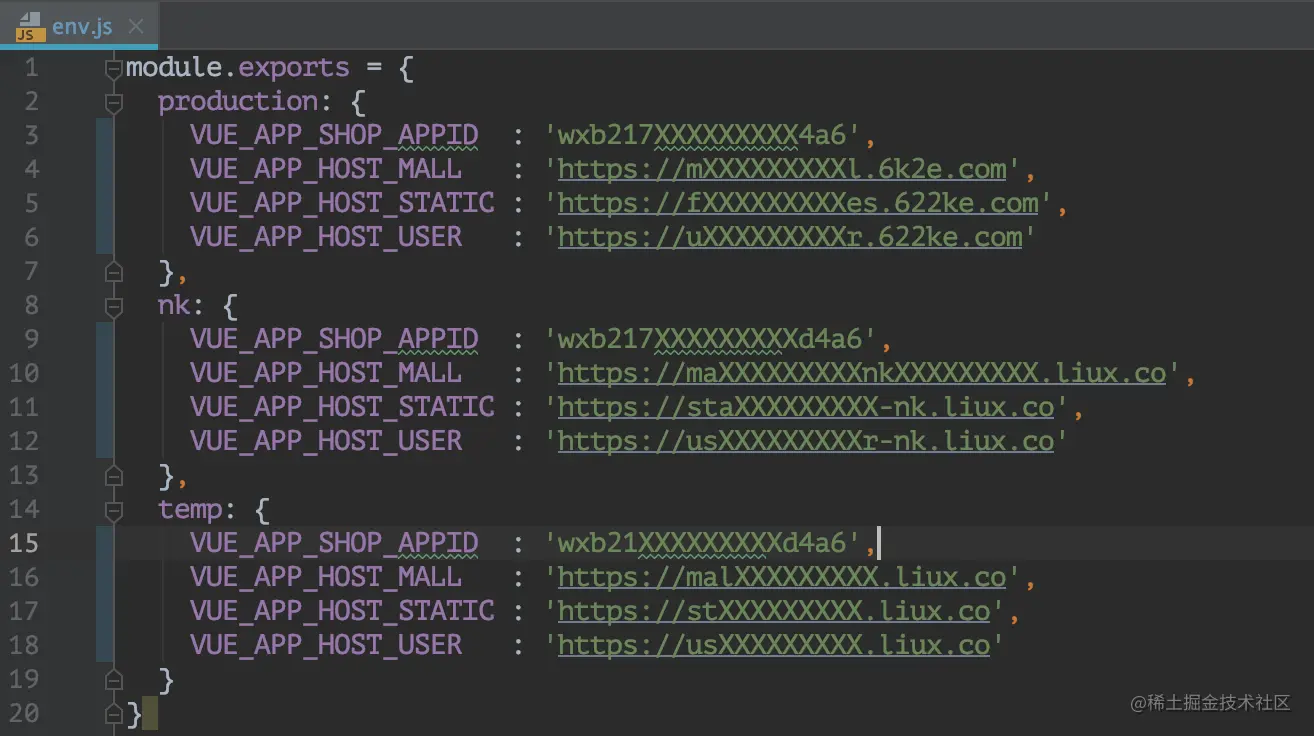 这里配置BASE用于区分环境 可看到一共有三个环境,分别是production、nk、temp(对应了env.js)
