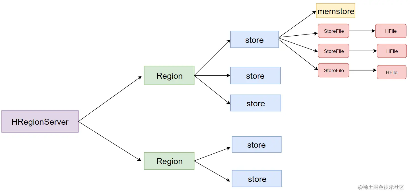 - 一个store里面有很多个**==StoreFile==, 最后数据是以很多个==HFile==**这种数据结构的文件保存在HDFS上