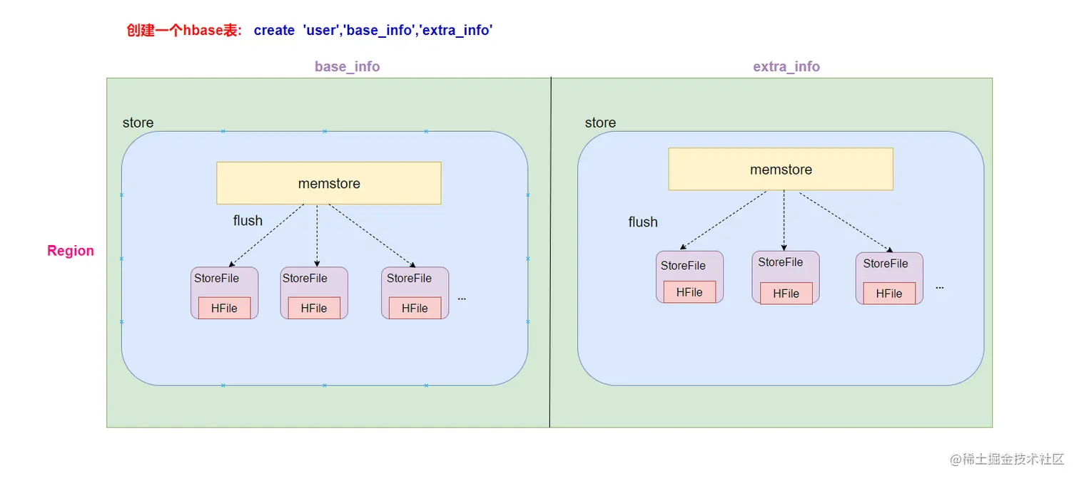 - 如果一个表中只有1个列族,那么每一个region中只有一个store