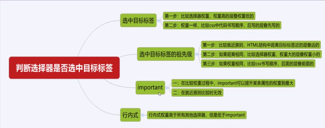 第一步:比较就近原则,比较选择器选中的祖先级在HTML结构中距离目标标签的远近,近的层叠远的。