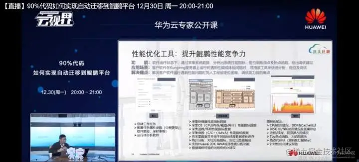 当移植完成之后,我们会提供一个性能分析的工具,去帮助用户去check这个软件是不是能够达到工作这样一个标准,也就是说check它的性能指标,我们会去进行系统性的性能分析,也会去做软件级的热点定位分析。然后在此基础上我们会给用户提供一些华为所积累下来的认为比较有效的一些软件优化的方法,做一些比如说终端版壳操作,甚至一些其他的软件修改的这样建议,这个就是我们今天要介绍的三款软件,通过这三款软件我们就能比较方便的或者比较高效率的完成C,C++代码,从非鲲鹏平台向鲲鹏平台的这样一个迁移值的过程。