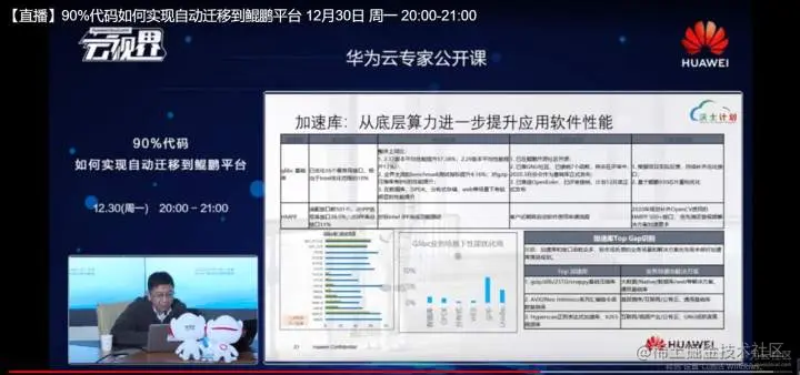 通过这样一个手段,我们就能帮助客户比较快的去帮助开发者比较快的定位自己的软件,编译形软件的瓶颈。,当定位到软件瓶颈的时候,我们会提供一些附加的能力,比如说这里我们就提供加一个叫加速库,我们软硬结合的加速库帮助用户去优化代码。这个原因是什么?这原因主要是因为我们鲲鹏是一个sock,我们是一个片量系统。