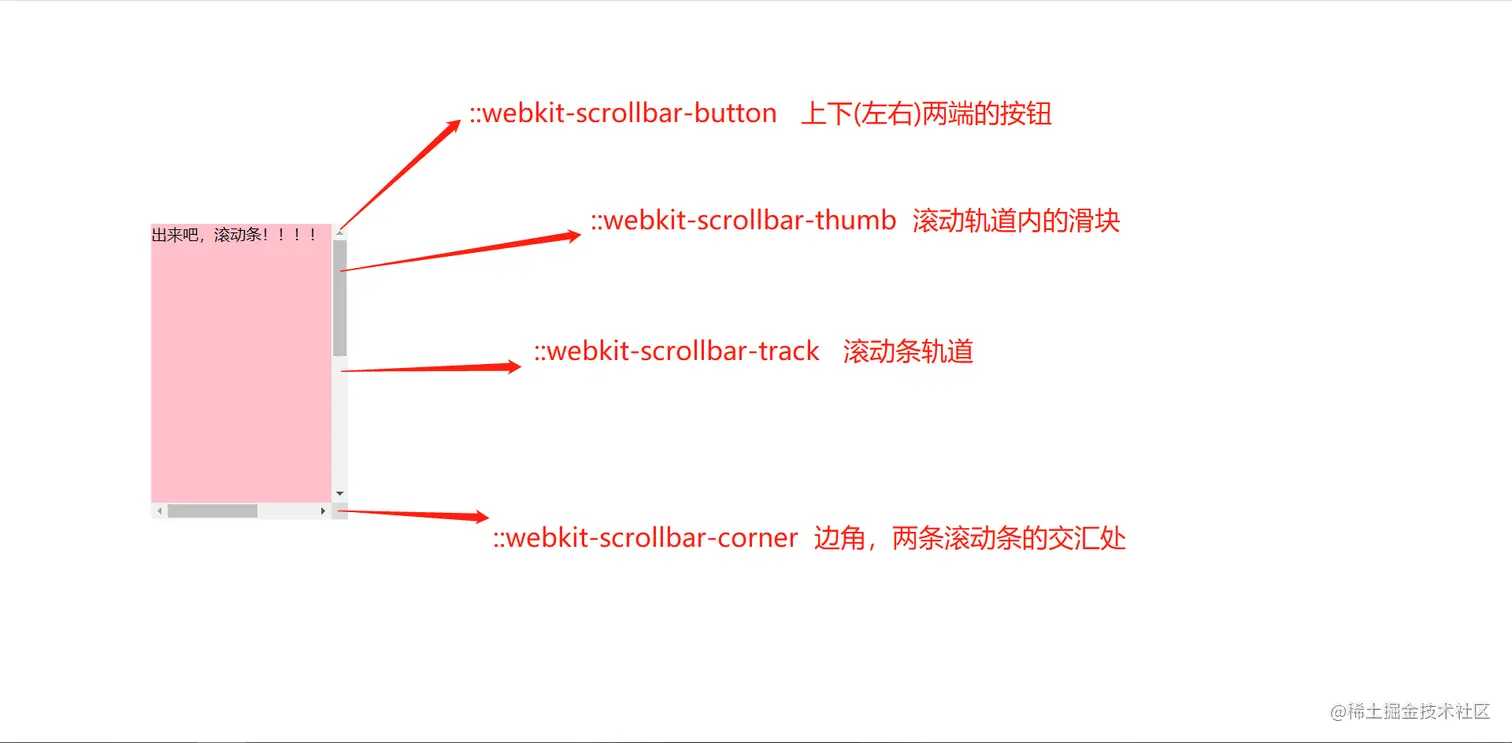 | ::-webkit-scrollbar-track-corner | 边角,即两个滚动条的交汇处 |
