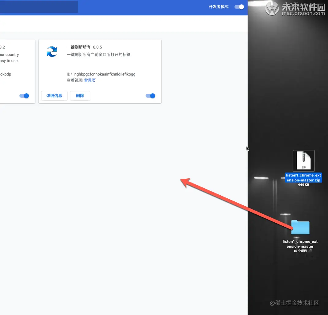 返回镜像包,将【listen1_chrome_extension-2.14.0.zip】拖到桌面并双击解压出文件夹,然后将解压后的文件夹,拖到谷歌浏览器的扩展界面,如图: