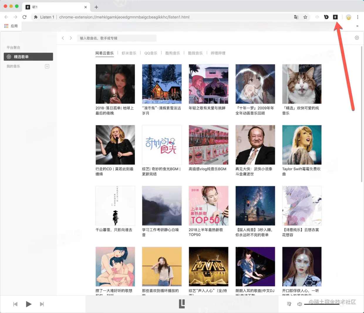 Listen1 安装完成后,可以在谷歌浏览器的右上角找到。