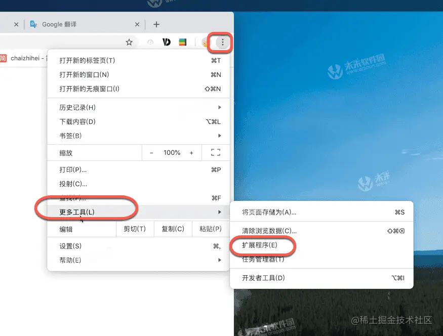 现在开始listen1 chrome插件版安装教程,我们打开谷歌浏览器,然后在右上角选择【:】,然后点击【更多工具】,在点击【扩展程序】,如图: