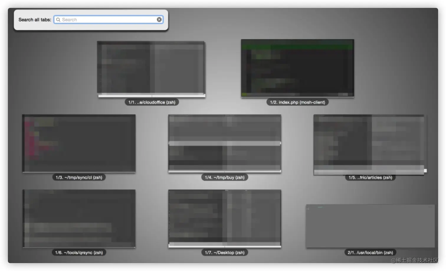 ⌘+Option+e全屏展示所有的 tab,可以搜索。