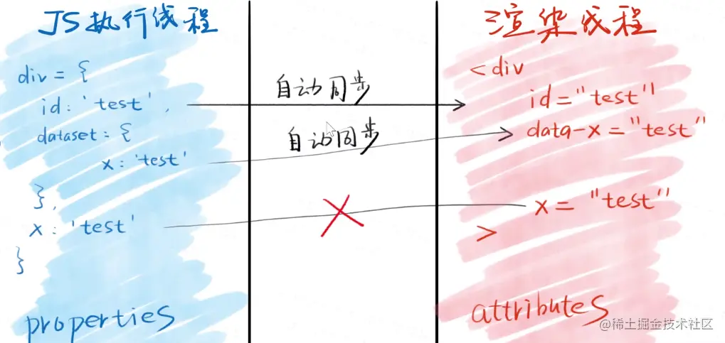 - properties是存在于JS线程中(JS引擎中) attributes是存在于渲染引擎中的
