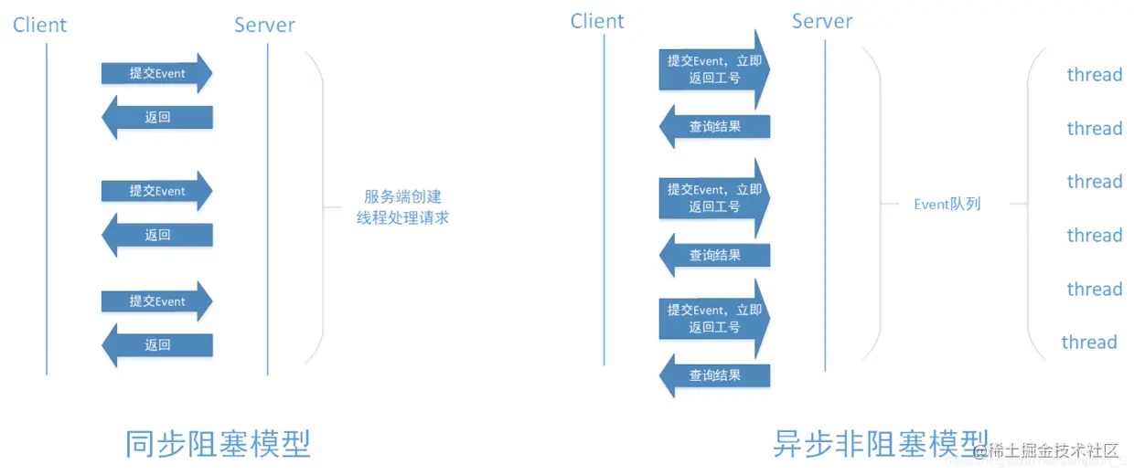 在客户端与服务端的通信过程中,一般情况下有两种通信模型,它们分别是同步阻塞模型和异步非阻塞模型。
