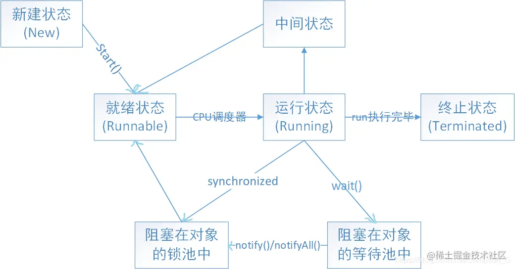 - 而当调用wait()方法的时候,线程会放弃对象锁(仍然持有资源),进入等待此对象的等待锁定池,只有针对此对象调用notify()方法后本线程才进入对象锁定池准备获取对象锁进入运行状态。