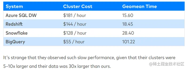 从测试结果来看,微软的Azure 的数据仓库性能排第一,Snowflake排第二。