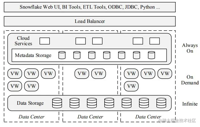 Snowflake架构分为三层,存储,计算和服务