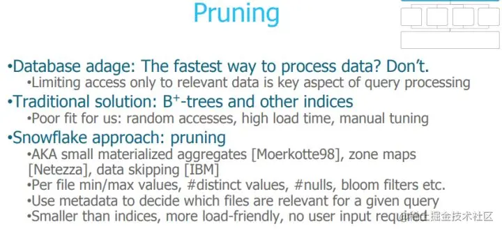 Snowflake支持修剪的技巧是在元文件中维护文件头,文件最大,最小,count,avg,sum等元数据信息。