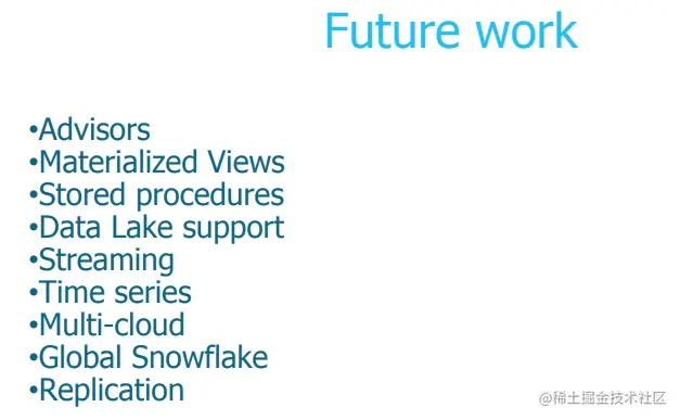 从Snowflake的后续版本规划来看,也可以看出业界数仓产品的部分演进方向,例如 自动调优,物化视图,数据湖,流数据处理,时序数据处理(毕竟IOT大数据的分析也是一个重点方向)。