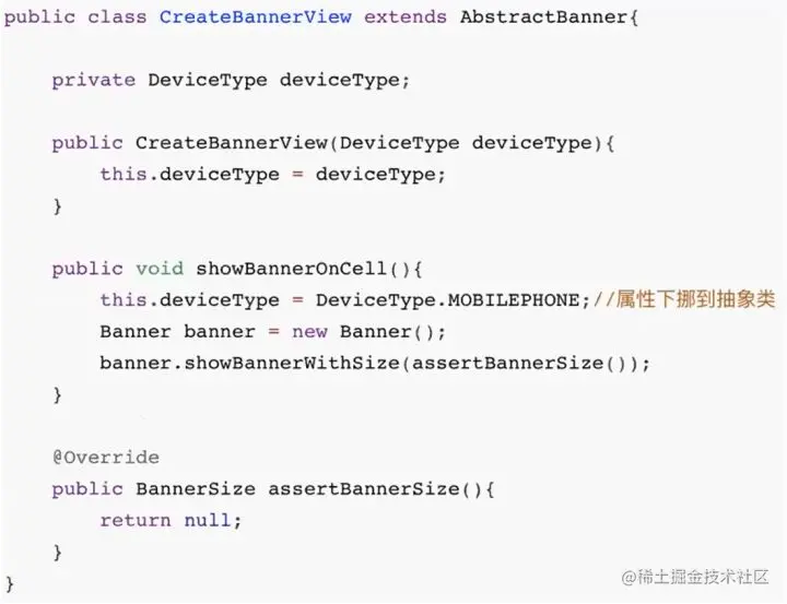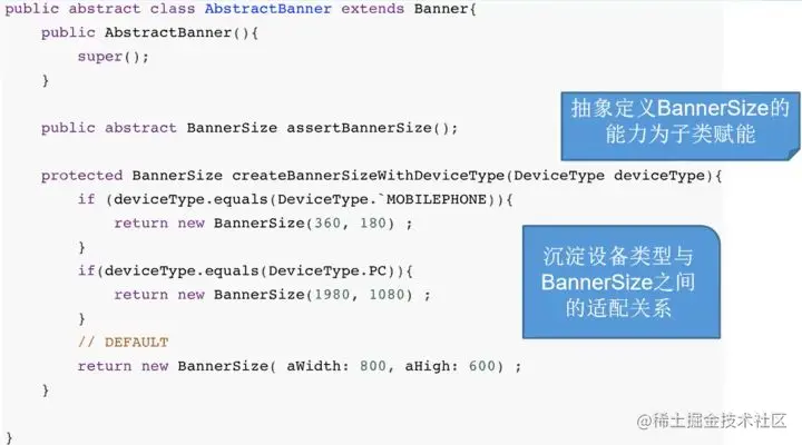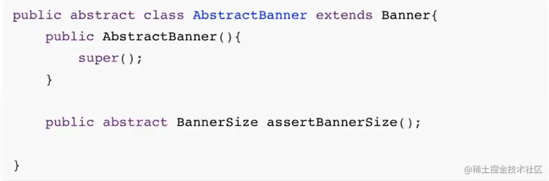 我们的策略可以用一句话来概括:**“间接”是程序员解决架构问题的钥匙。**具体来说继承方式是扩展一个抽象子类,增加一个确定BannerSize的能力: