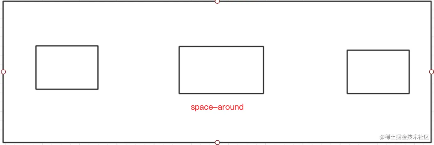 space-around是每个子元素两侧的间距都相等,所有子元素之间的间隔是元素于边框之间间隔的一倍。