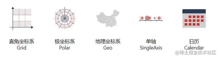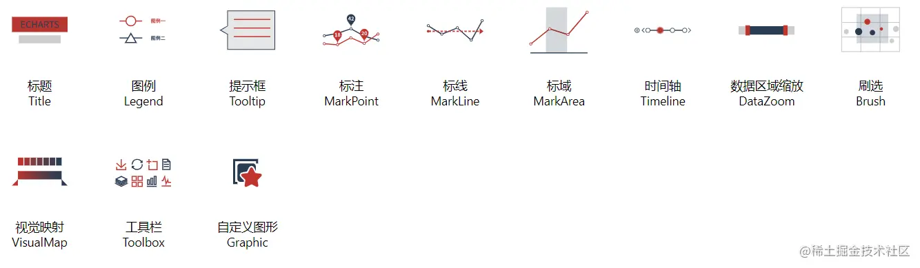 下图为可能用到的组件(组件在echarts中指的是option配置项),如果你经常和excel或者PPT打交道,前6个想必应该很熟悉吧: