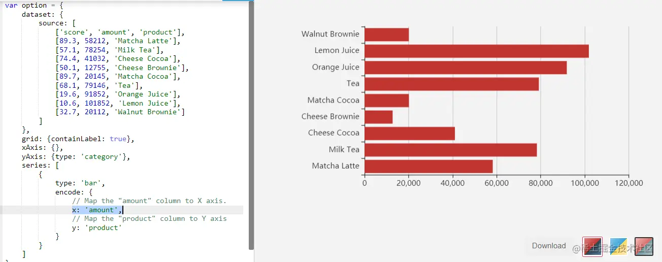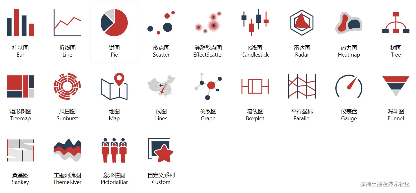 echarts中所有图表(坐标系/类型/组件)都是通过定义配置项option来完成的,具体用法官网有说明,用到的时候直接CV就好,这里就不一一举例了