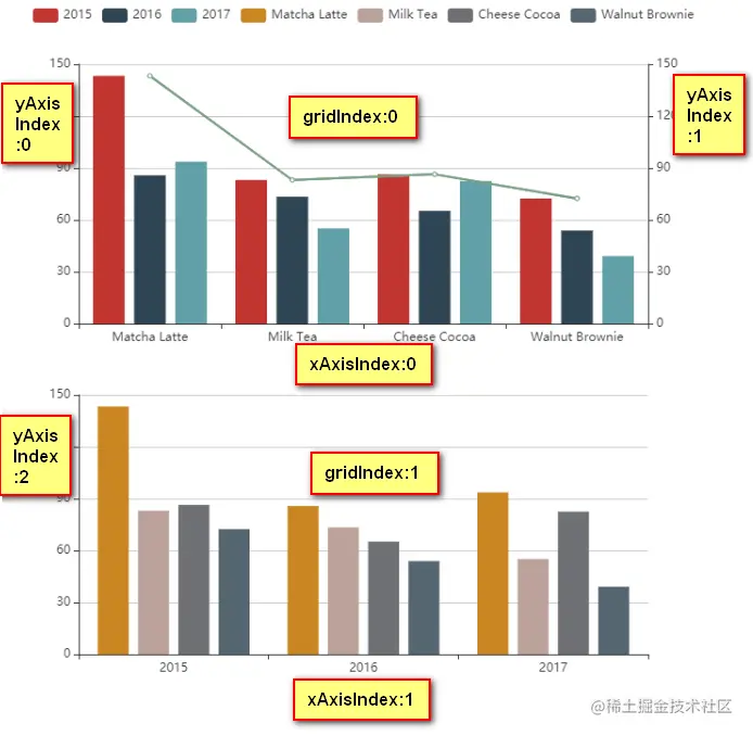 对于坐标轴需重点了解yAxisIndex(series),下面的例子很好的说明