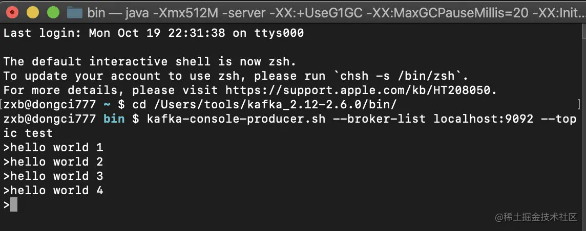 kafka-console-producer.sh --broker-list localhost:9092 --topic test // test为你的topic名字