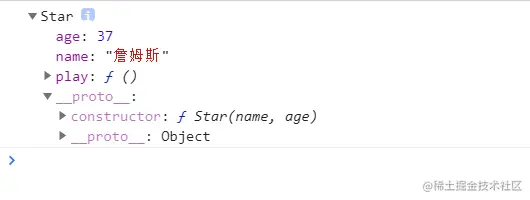 可以看到prototype是一个对象。那prototype有啥用呢?我们可以把那些不变的方法,直接定义在prototype原型上,这样所有对象的实例就可以共享这些方法,这样就可以避免内存浪费的问题,比如我再通过new Star()去实例一个新的对象,新的对象也会有paly方法,由于函数属于复杂数据类型,这样内存就又会开辟空间去存储这个函数,这样就会造成内存浪费。