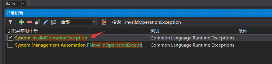 除了从异常堆栈中找到最早的异常代码处,这里还说一个小技巧,使用 ndspy 的 异常断点功能,在异常设置面板 定位 InvalidOperationException 异常即可。