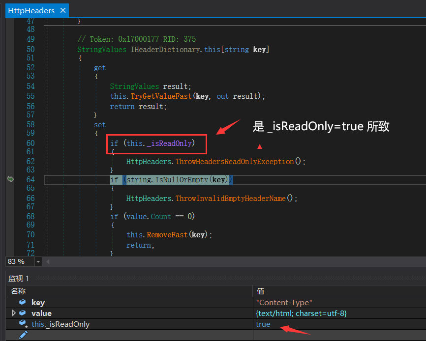 从图中可以看到,最后的 HttpHeader._isReadOnly =true 导致异常的发生,罪魁祸首哈,接下来研究下这句 HttpHeader._isReadOnly=true 是何时被赋值的。