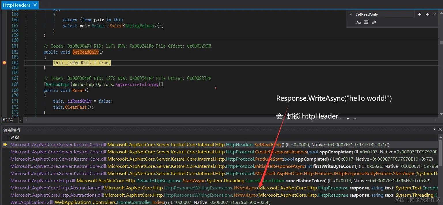 这个问题就简单多了,必定是 Response.WriteAsync("hello world!"); 造成了 _isReadOnly=true ,在 HttpHeader 下有一个 SetReadOnly 方法用于对 _isReadOnly 字段的封装,代码如下: