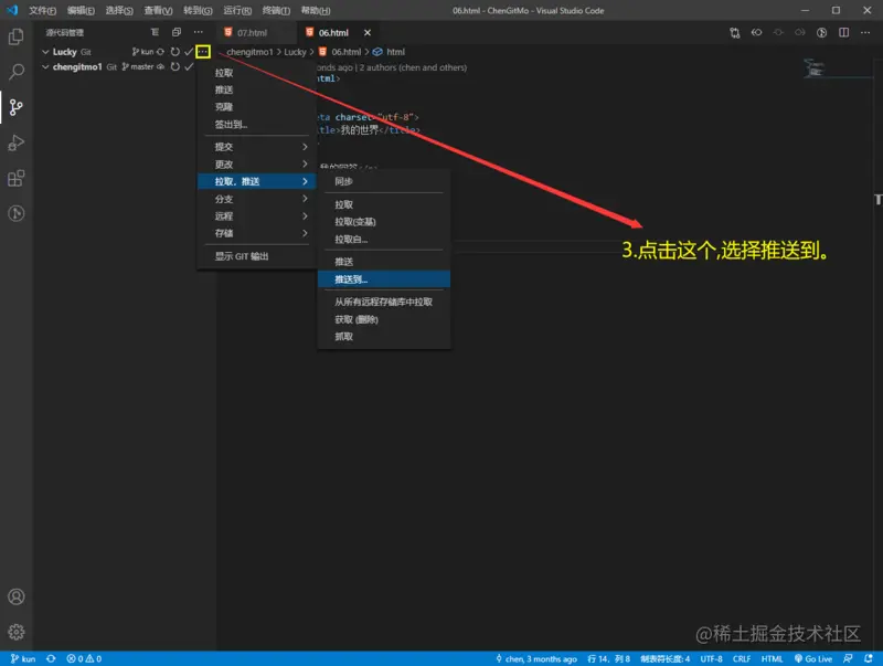 3.在开发的过程中,我们总是会使用到git,下面我说一下,在使用 vs code中,怎么把项目提交到码云上,方法如下: