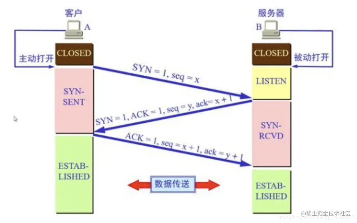 - 客户端发送SYN(SEQ=x)报文给服务器端,进入SYN_SEND状态。
