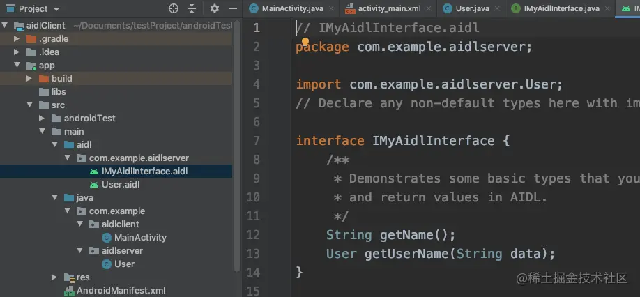 其中IMyAidlInterface.aidl与User.aidl必须保证与server端完全一致,所以将server端的aidl文件夹复制到client端就可以了