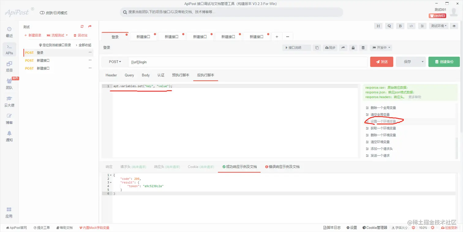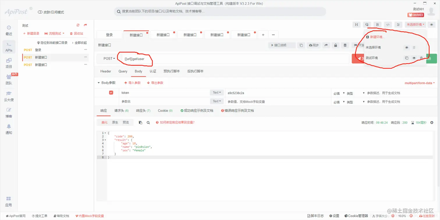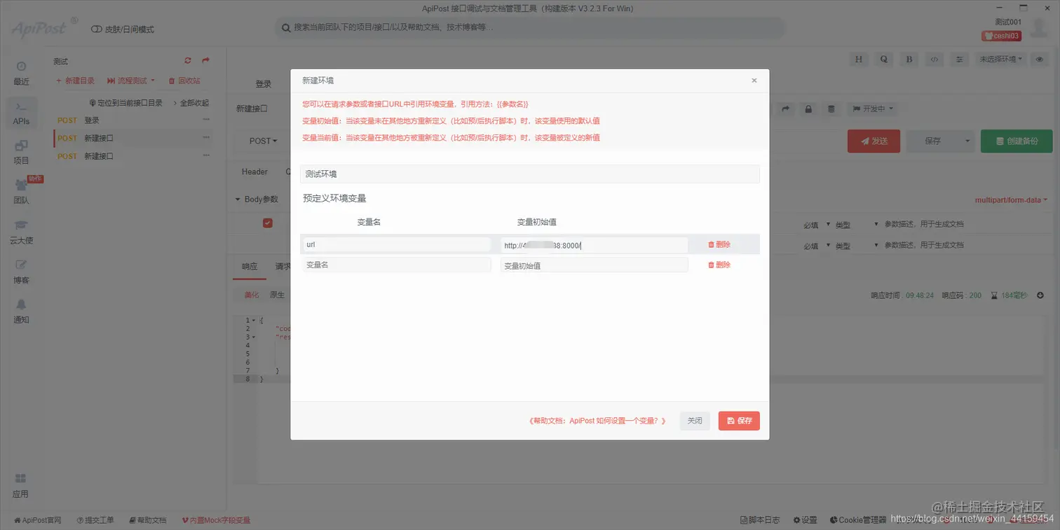 因为登录和查询操作的前一部分url相同我们可以把相同的部分设置成环境变量,因为apipost必需再有环境的时候才能对token进行参数化,所以首先我们来进行环境设置